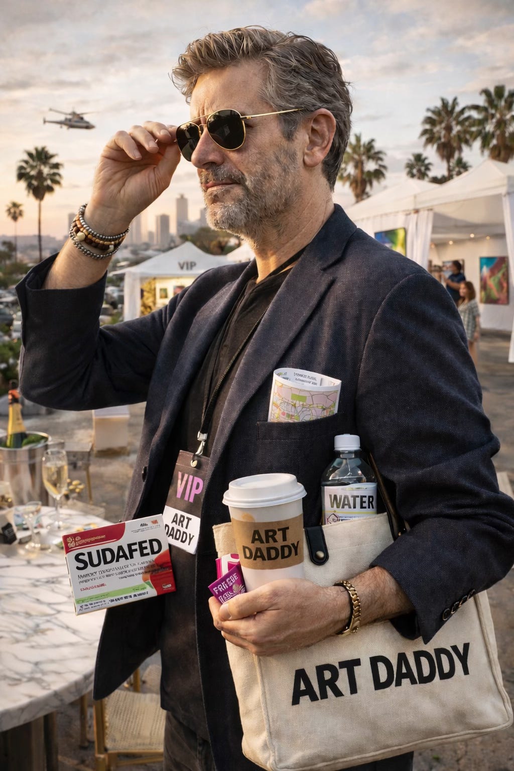 Art Daddy has landed in LA and I think I am finally understanding why people love it. Arriving on a red eye that left during a literal blizzard a day before and landning at a dead, glowing, almost suspiciously calm LAX is psychological whiplash at 5 AM EST. My travel got pushed back three times this week. It was chaotic. It was dramatic. It was meteorologically violent. And yet somehow, I was early. I had time for wine. I responsibly engineered my Xanax and Benadryl travel cocktail. I slept almost four hours. Growth. But am now congested among other things.
