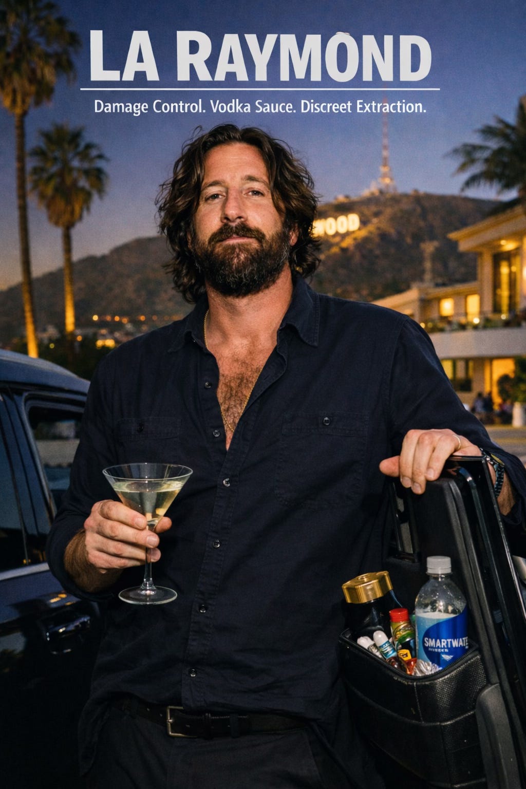 By night, Raymond transitions seamlessly into LA fixer, personal driver, and vodka sauce provisioner. The SUV idles. The martini waits. He will circle Santa Monica while you debate whether you are powerful enough to re-enter the tent. Need a table at something “impossible”? Wristband secured. Need someone gently removed from your orbit? Consider it handled. And when the fair day ends and your serotonin dips, Raymond delivers late-night pasta therapy to your hotel room, sauce calibrated to your emotional bandwidth. He does not judge. He stabilizes. Daddy supervises, but Raymond keeps the engine running.